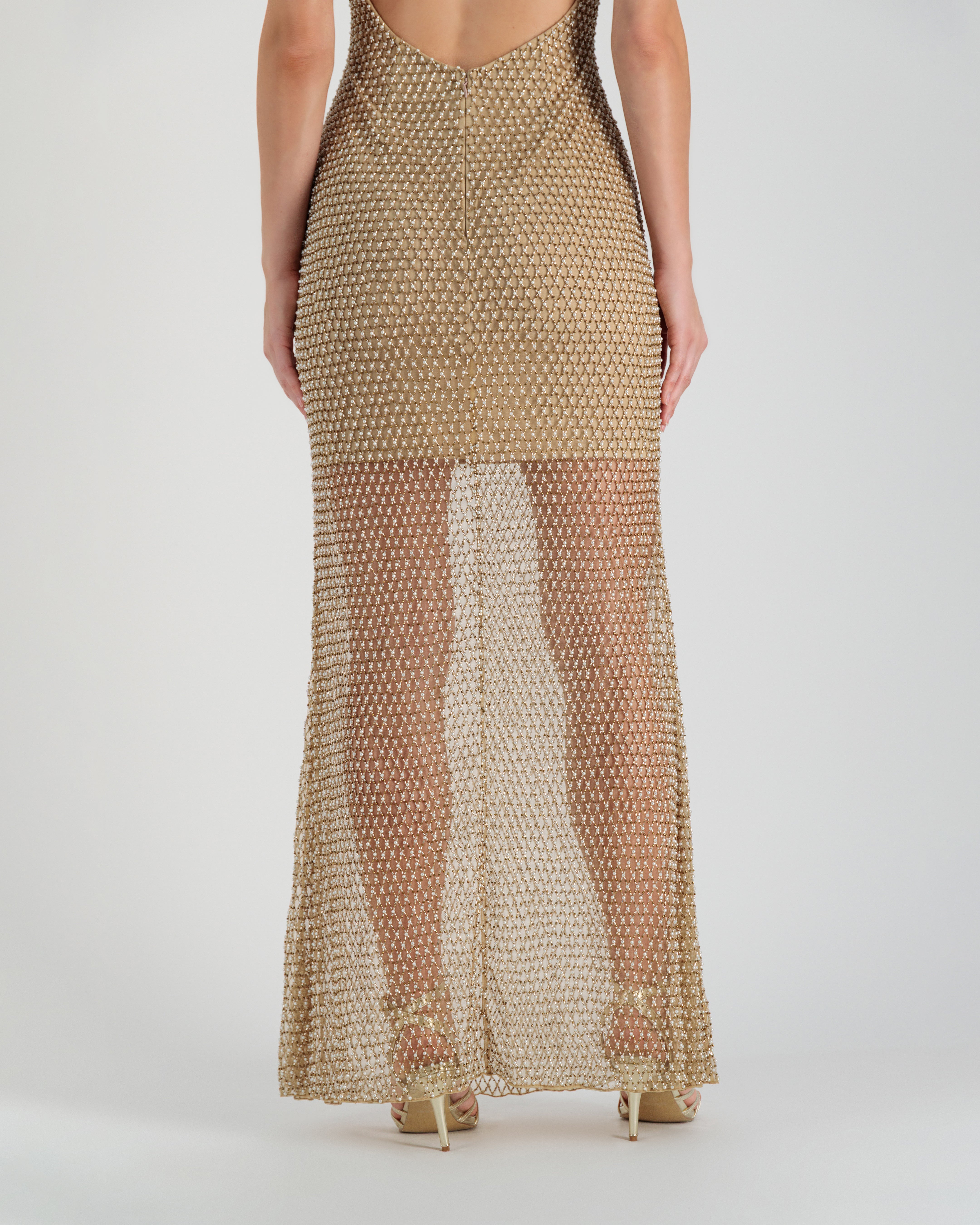Construction: Fitted silhouette, V-neckline, fine straps, full-length embellished design; light stretch for comfortable movement.