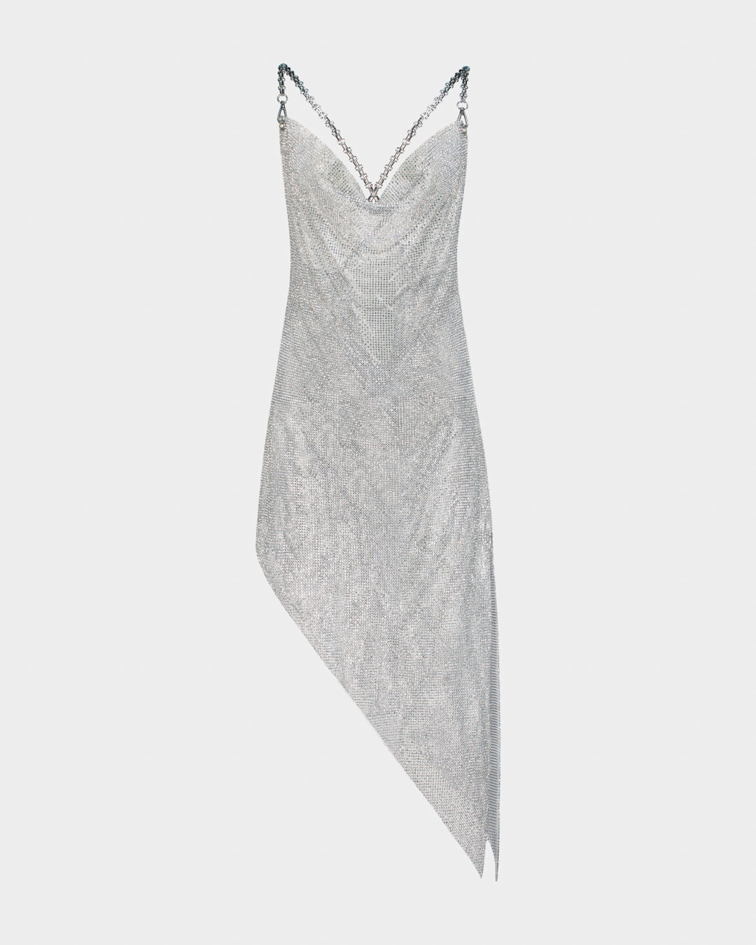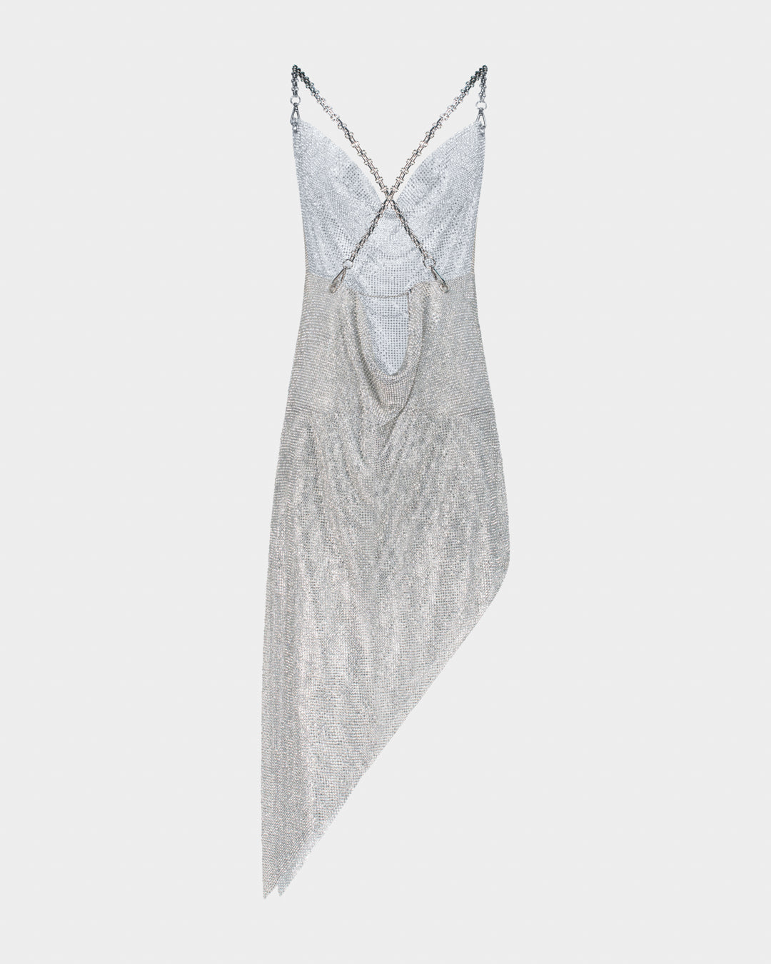 An asymmetrical silver crystal mesh dress featuring a draped cowl neckline, delicate chain straps, and a fluid silhouette that moves with the body. Designed with a deep V front and an open crossed-back structure, the piece finishes with a signature diagonal hemline for an elongated, sculpted effect.